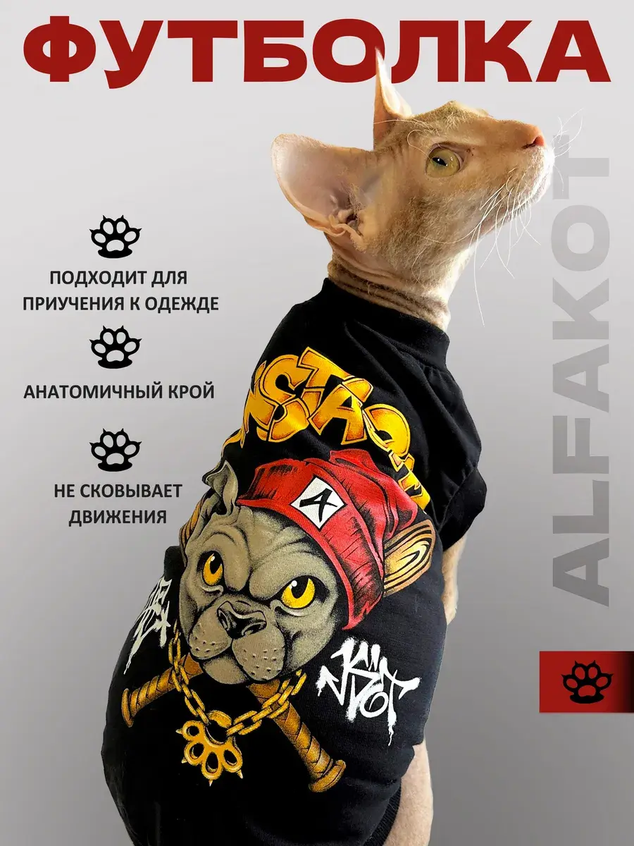 Одежда для сфинксов выполнена из 100% хлопка, имеет анатомический крой. Дышащий материал футболки для котов позволяет использовать её ежедневно дома и на прогулке, защищая нежную кожу сфинкса от холода, сквозняков, тепловых ожогов и царапин. Гипоаллергенный состав ткани гарантирует отсутствие раздражений, а стильный дизайнерский принт подчеркивает неповторимый характер вашего питомца. Одежда для кошек АЛЬФАКОТ станет отличным подарком для вашего любимца, особенно в преддверии Нового года.