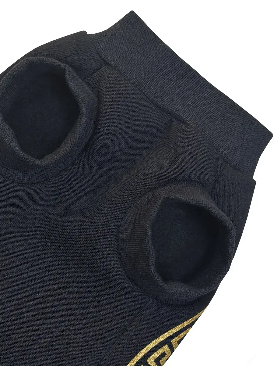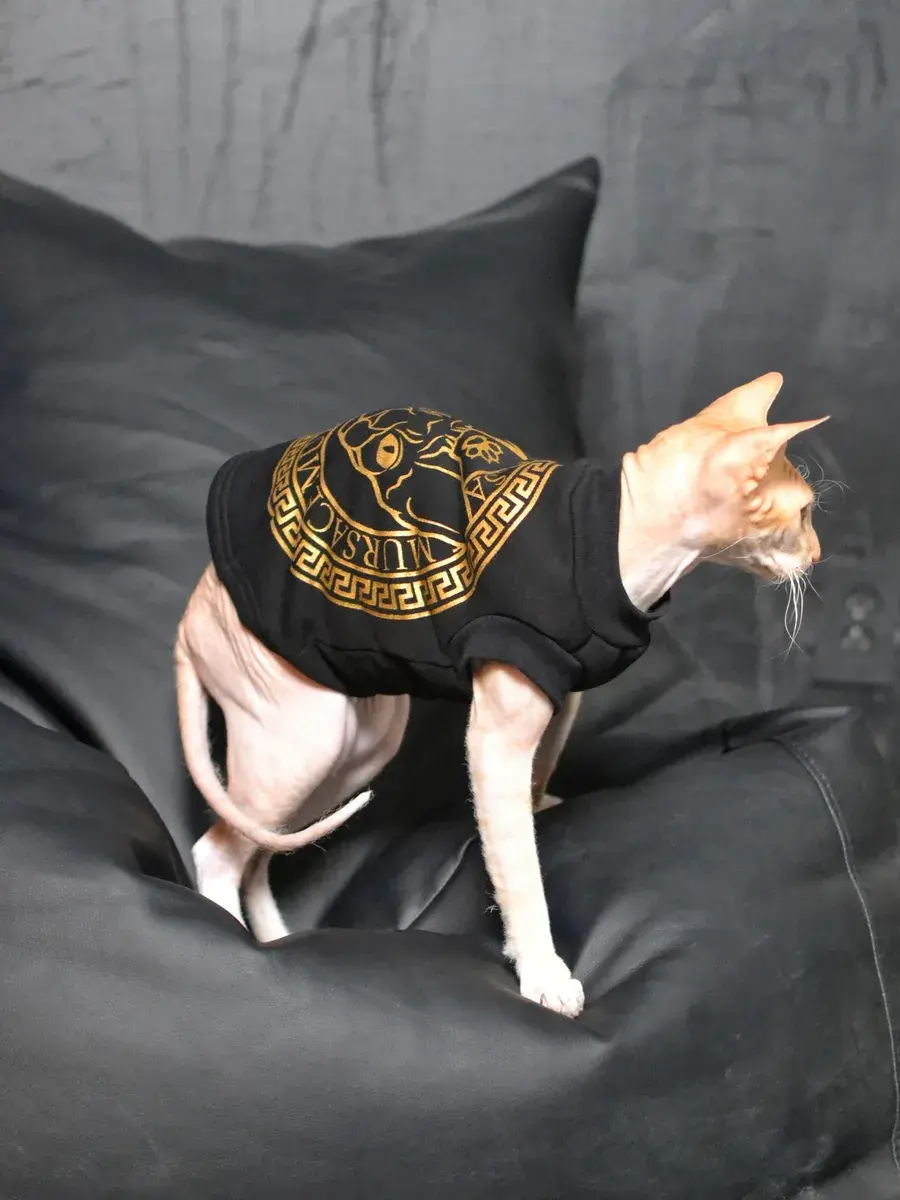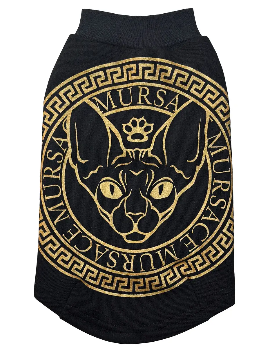 Одежда для кошек, толстовка с начёсом ALFAKOT для котов, кошек, котят, мелких пород собак, цвет черный с мерцающим золотистым принтом Mursace. Свитер выполнен из ткани футер с начесом. Кофта alfa kot c ярким принтом станет отличным нарядом для котика и будет радовать взгляды окружающих.