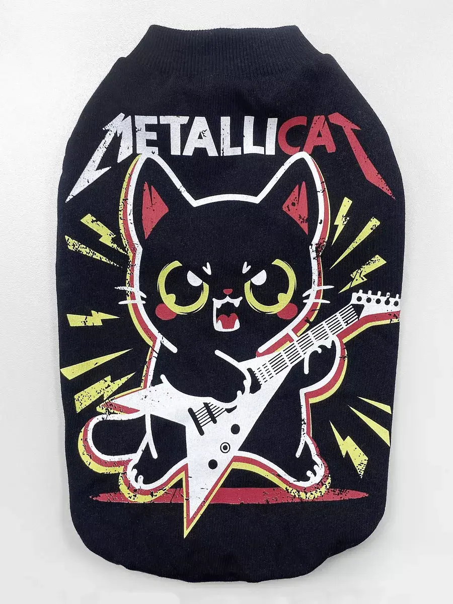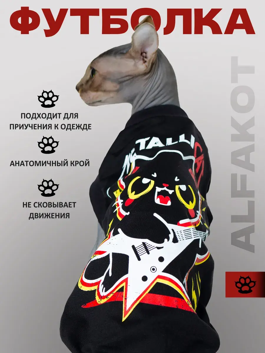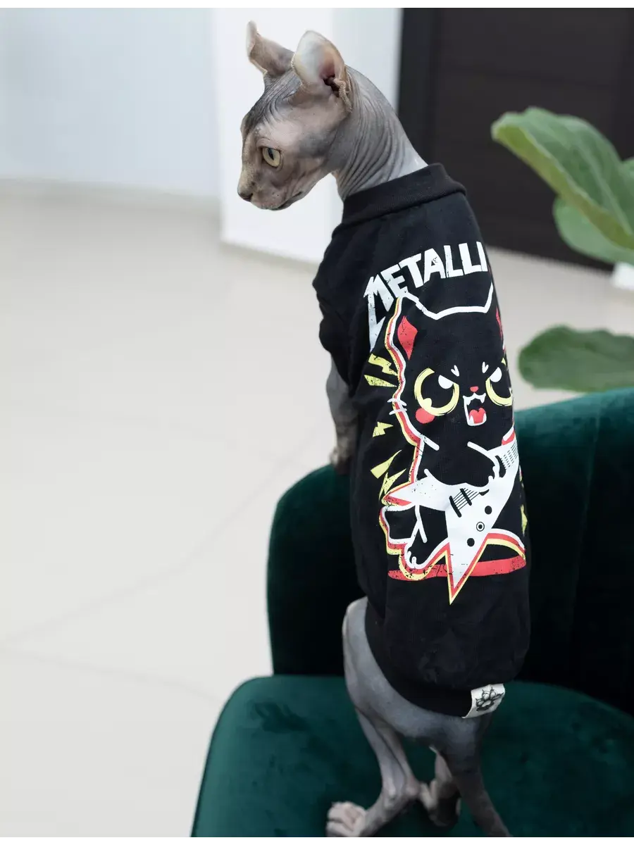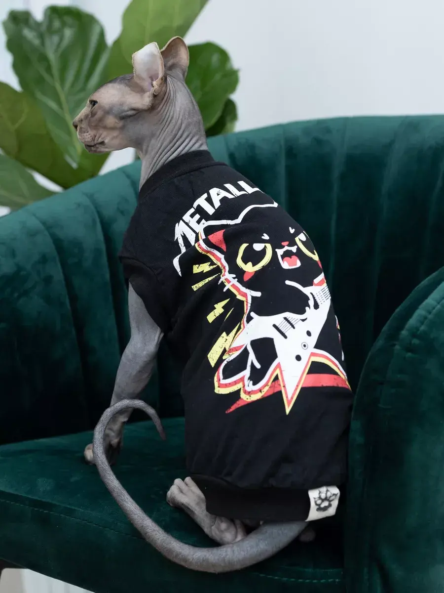 Одежда для кошек футболка ALFAKOT для котов, кошек, котят/ Одежда для животных с принтом "MetalliCat" от российского бренда Альфакот подойдет для кошек породы сфинкс, а также других пород кошек. Безрукавка "кимоно" разрабатывалась специально для кошек с учётом их анатомии.