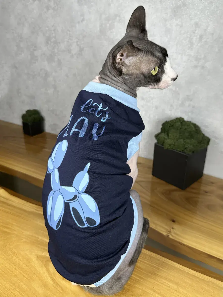 Футболка ALFAKOT для котов, кошек, котят, собак. Одежда для животных футболка с голубым переливающимся на свете принтом Lets Play "Шарик" темно-синего цвета от российского бренда Альфакот подойдет для кошек породы сфинкс, а также других пород кошек и мелких пород собак. Безрукавка "кимоно" разрабатывалась специально для кошек с учётом их анатомии.
