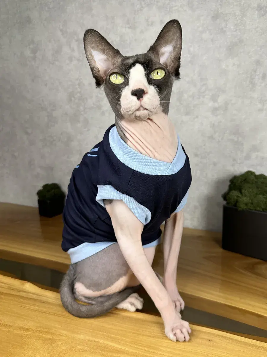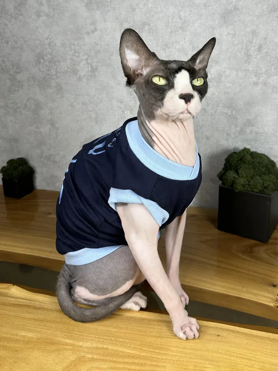Кошачья майка alfa kot для сфинксов согреет в холодное время года, а также спасёт в жару от солнечных ожогов, послужит защитой от царапин и насекомых. Кофта из трикотажа подходит для носки в летнее время и в демисезон.