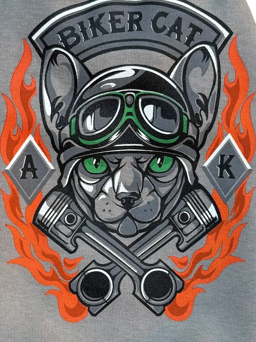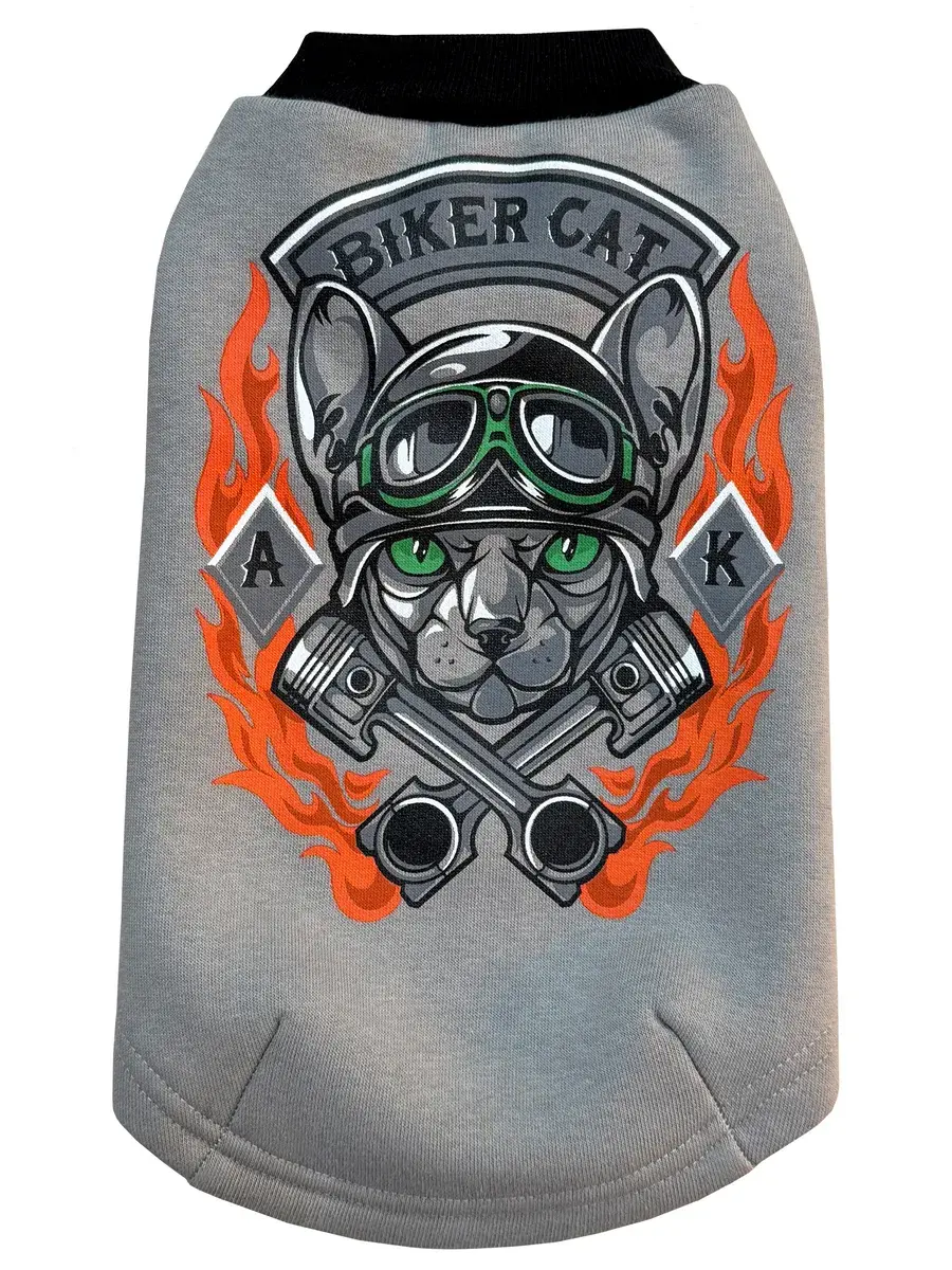 Толстовка с начёсом ALFAKOT для котов, кошек, котят, серого цвета с черным манжетами. Свитер выполнен из ткани футер с начесом. Кофта alfa kot c дизайнерский принтом Biker Cat станет отличным нарядом для котика и будет радовать взгляды окружающих. Чтобы подобрать подходящий размер, рекомендуем использовать размерную таблицу в карусели с фото.